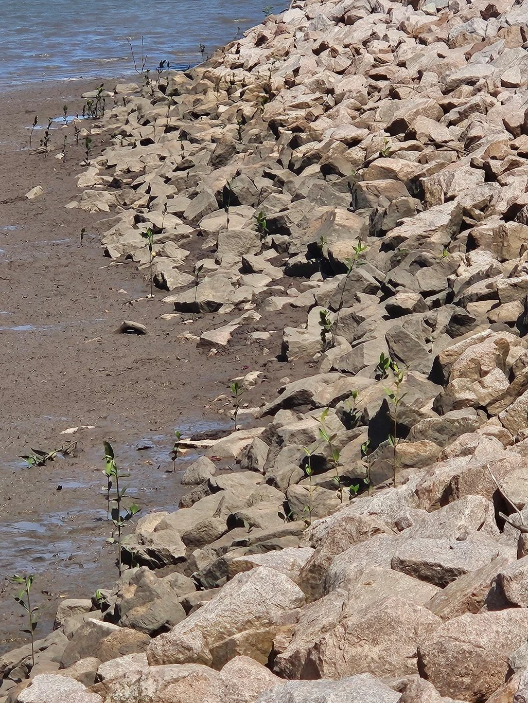 The growth of mangroves throughout the rock works enhancing long-term protection and a successful restoration.