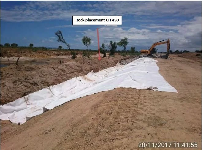 Over 500m of the breakout in the levee needed to be reconstructed with clay fill and faced with armour rock above what was left of the existing embayment works. The restoration works now had to relate to much higher river bed levels and flood levels in the area of the entrance to the 1946 Mouth.