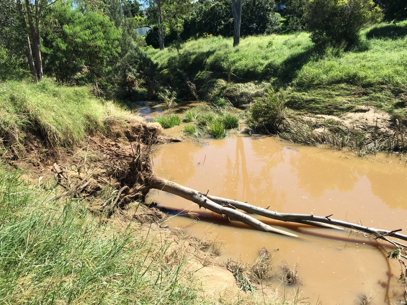March 2021, post summer rains – The erosion has caused the tree to fall into creek. Looking downstream.